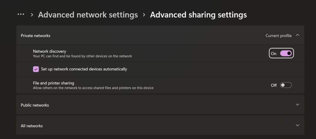 - Sous « Paramètres de partage avancés », sélectionnez l'option « Activer la découverte du réseau ».