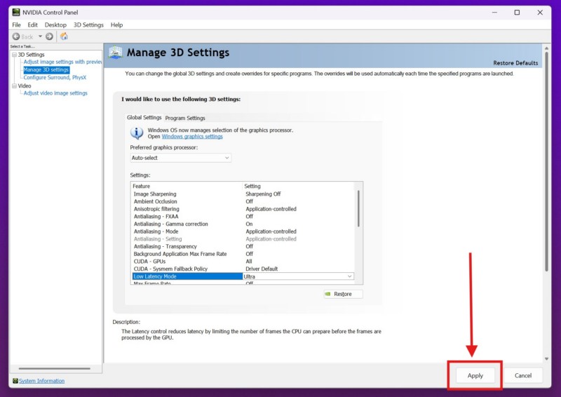 5. Activez le mode faible latence dans le panneau de configuration NVIDIA sous Windows 11