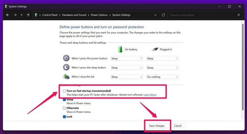 6.Une fois les options de la section Paramètres d'arrêt débloquées,cliquez sur le case à cocherpour leActivez l'option de démarrage rapide (recommandé)àdécochez la case. Cela désactivera ladite fonctionnalité sur votre PC ou ordinateur portable Windows 11.