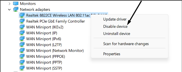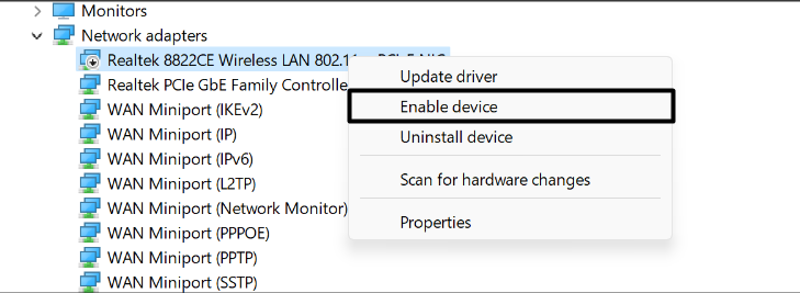 Nous vous suggérons d’abord de réactiver les pilotes. Si la réactivation des adaptateurs réseau WAN Miniport ne résout pas le problème, vous pouvez envisager de les mettre à jour. Nous avons expliqué comment faire facilement la même chose dans les étapes mentionnées ci-dessous :
