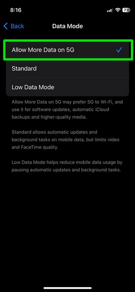 5.Ici, assurez-vous que le mode données est défini surStandardouAutoriser plus de données sur la 5Gsur votre appareil.