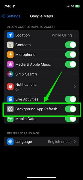 3. Sur la page des paramètres de l'application suivante, assurez-vous que la bascule pour leActualisation de l'application en arrière-planoptionest allumésur votre iPhone.