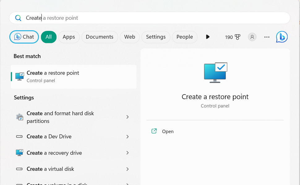 2.ChoisirCréer un point de restaurationà partir des résultats de la recherche pour ouvrir leRestauration du systèmeoutil.