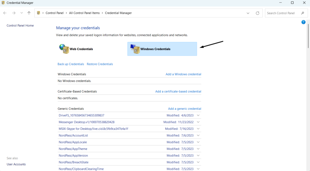 3.Dans la fenêtre suivante, sélectionnez leInformations d'identification Windowsoption pour afficher toutes vos informations d’identification Windows.