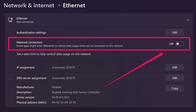 Par conséquent, certains utilisateurs ont signalé que la désactivation de l’option de connexion mesurée pour le réseau Ethernet dans Windows 11 pourrait résoudre la fonctionnalité Windows Spotlight. Voici comment désactiver l’option de connexion mesurée pour Ethernet dans Windows 11 :