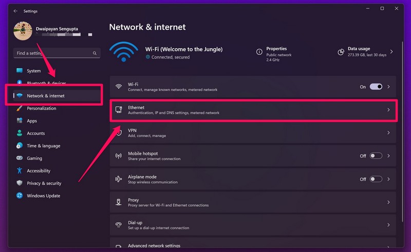2.Sous leRéseau & internetdans la barre de navigation de gauche, cliquez sur l'ongletEthernetoption.