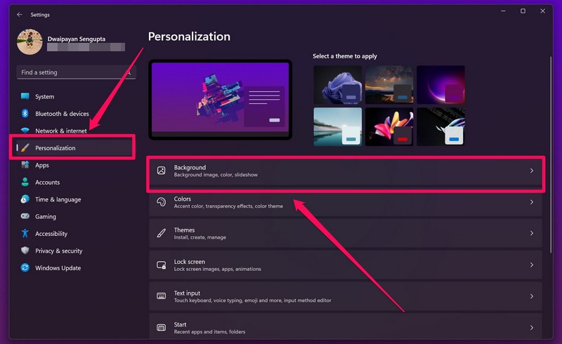 2.Allez auPersonnalisationonglet sur la barre de navigation de gauche et cliquez surArrière-plan.