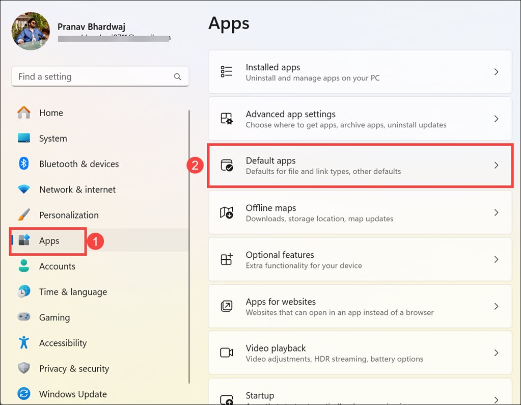 2.Sur le côté gauche des paramètres, choisissez leApplicationsoption, puis passez àApplications par défaut.