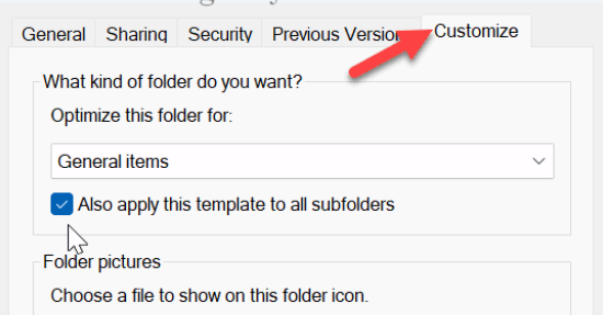 3.Dans lePersonnaliseronglet, sousOptimisez ce dossier pour, cocherAppliquez également ce modèle à tous les sous-dossiers.