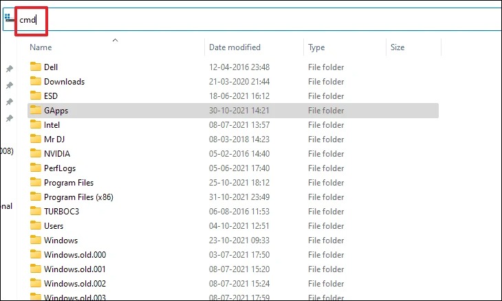 2.Une fois que vous y êtes, cliquez sur la barre d'adresse en haut, tapezcmddedans, et frappeEntrerpour ouvrir CMD.