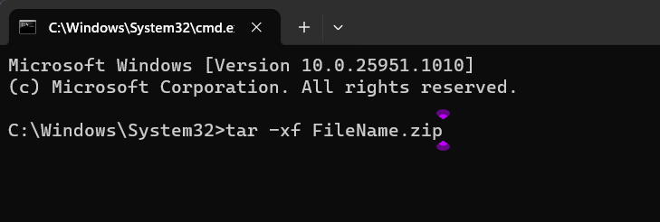 3.Dans leInvite de commandefenêtre, copiez-collez la commande tar -xf FileName.zip et appuyez sur le boutonTouche Entrée.