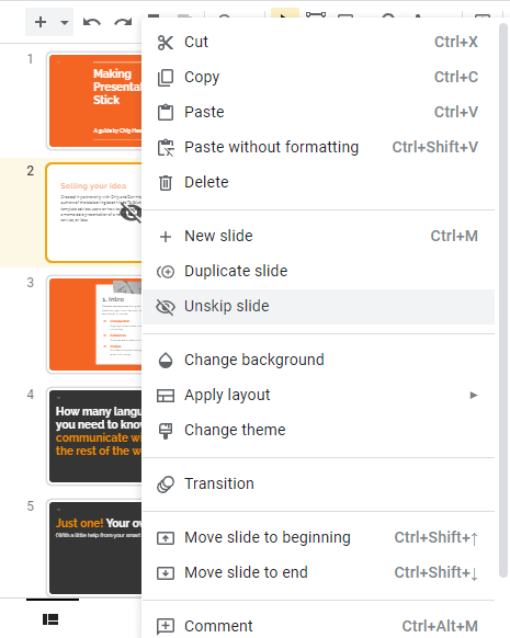 C'est pourquoi Google Slides inclut la possibilité d'ignorer les diapositives sélectionnées. Vous pouvez conserver votre travail acharné pour une utilisation potentielle tout en vous assurant qu'il ne soit pas lu dans le diaporama.