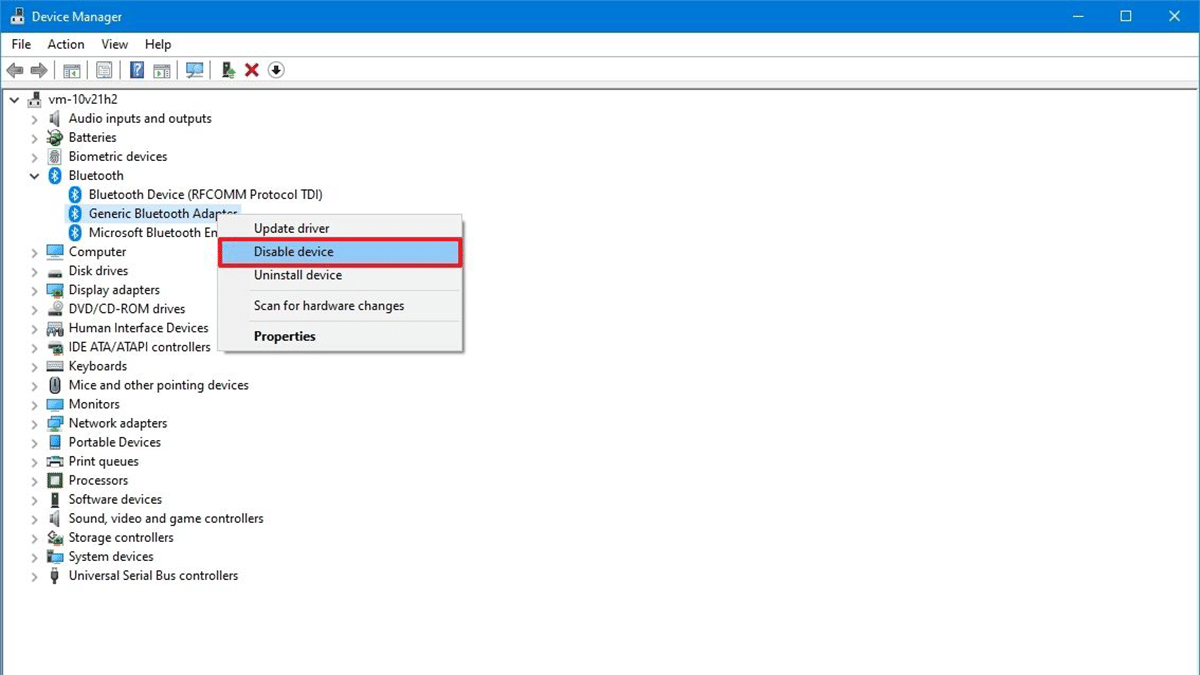 - Développez leBluetoothbranche > cliquez avec le bouton droit sur l'adaptateur sans fil et sélectionnez leDésactiver l'appareiloption.