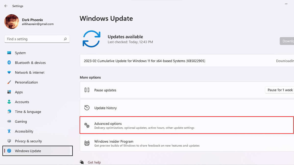 - OuvrirParamètres> cliquez surMise à jour Windows> cliquezOptions avancées.