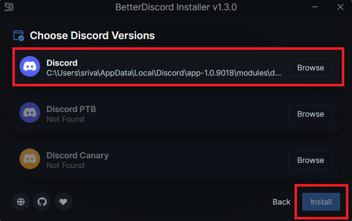 6.Sélectionnez votre version actuelle de Discord et cliquez sur le boutonInstallerbouton pour démarrer le processus d’installation.