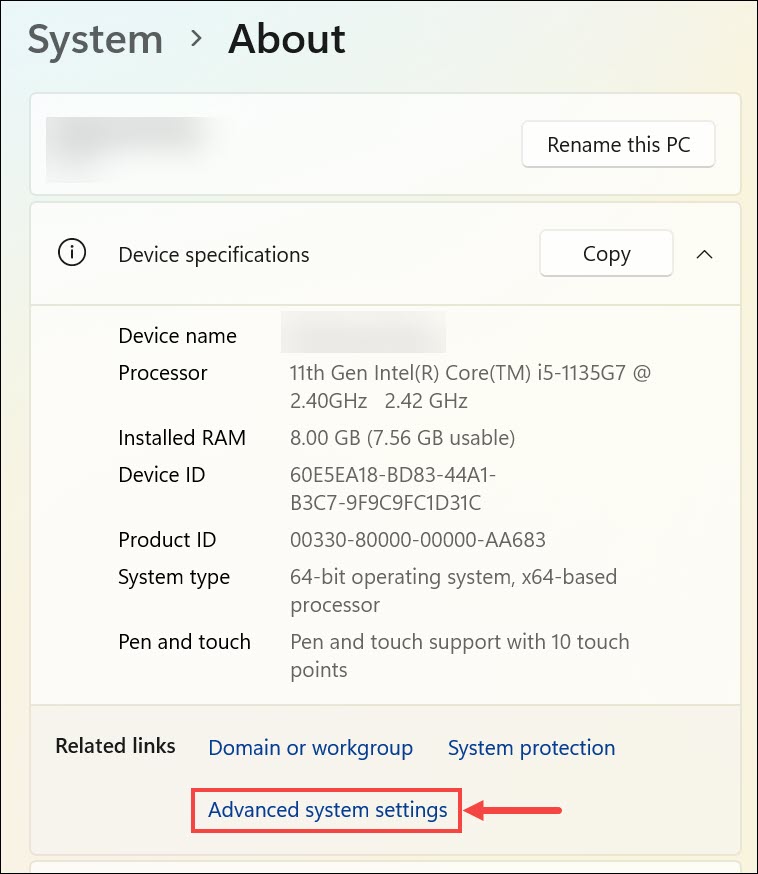 3.Dans la section À propos, cliquez sur «Paramètres système avancés" dans le menu de gauche. Cela ouvrira la fenêtre Propriétés système.