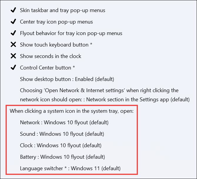 4.Vous pouvez également activer l'ancien style de menu volant de Windows 10 pourRéseau, Son, Horloge, Batterie,etSélecteur de langue.