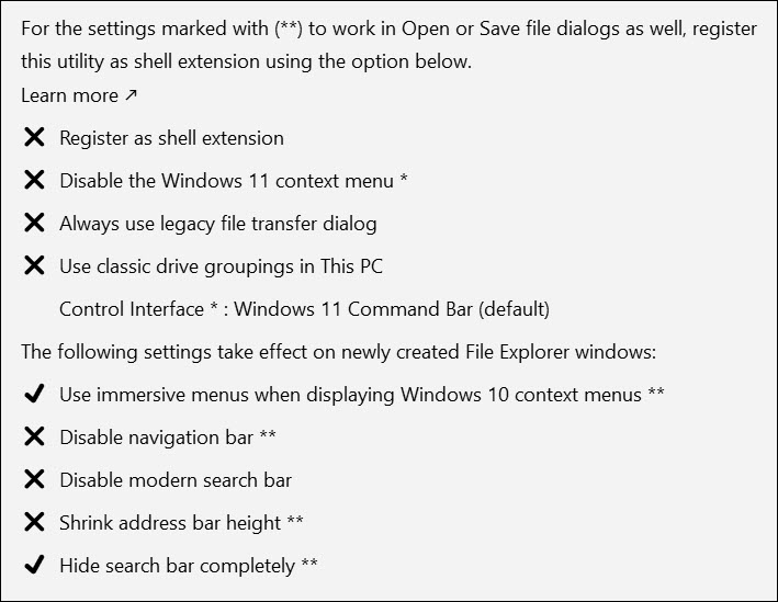 L'utilitaire est destiné à améliorer l'expérience utilisateur en leur permettant d'ajuster divers aspects visuels tout en maintenant la stabilité et la sécurité du système d'exploitation. Les principales fonctionnalités d'ExplorerPatcher incluent :