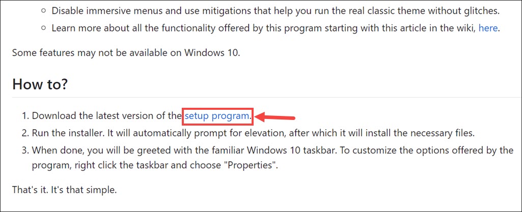 1.Visitez le GitHub Valinet "Comment faire" section sous Wiki. Valinet est le créateur d'ExplorerPatcher.