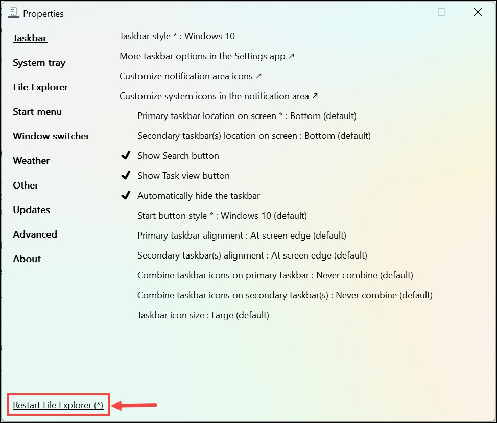 4.Après avoir apporté des modifications, n'oubliez pas de cliquer sur leRedémarrer l'explorateur de fichiersen bas à gauche pour les appliquer.