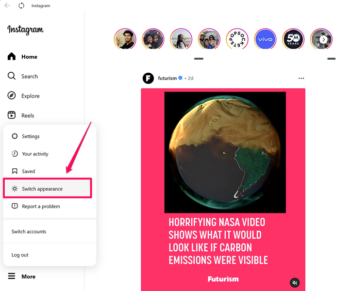1.Sur votre page d'accueil Instagram, cliquez sur le boutonChangerà côté de l'icône de votre profil dans le coin supérieur droit.