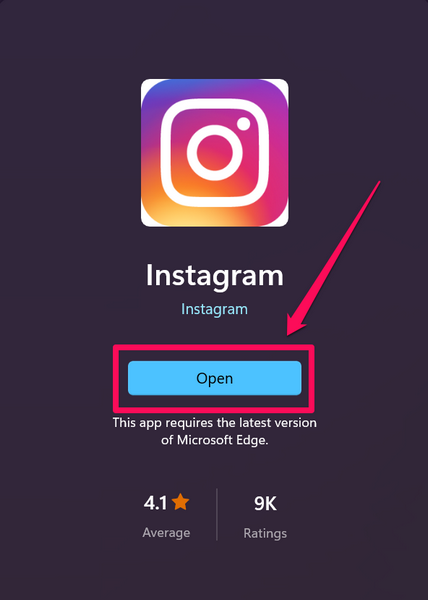 1.Une fois l'application Instagram installée, vous pouvez l'ouvrir avec leOuvrirsur le Microsoft Store ou recherchez-le dans le menu Démarrer et cliquez dessus avec le bouton gauche.