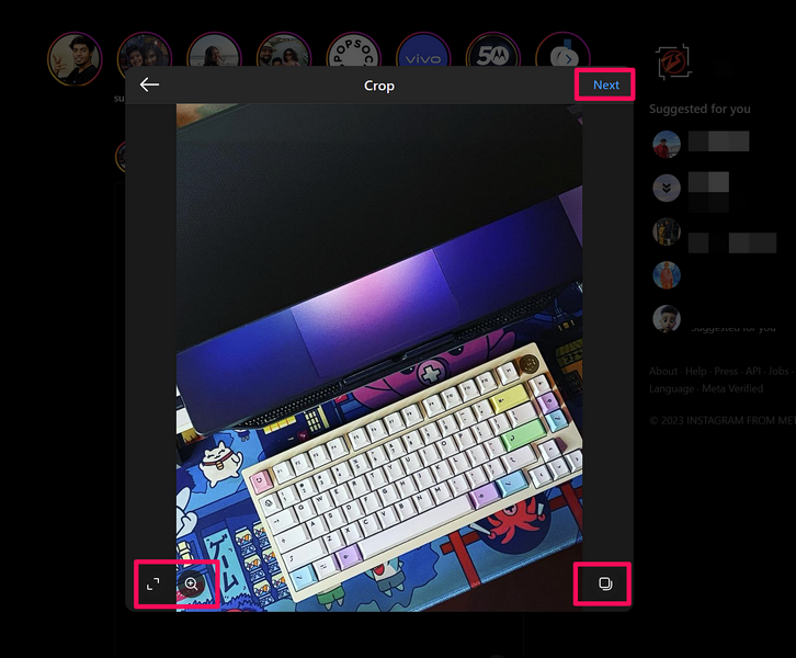 3.Une fois l'image ou la vidéo ajoutée, l'application l'ouvrira dans un éditeur. Avec l'éditeur, vous pouvezdéfinissez votre rapport hauteur/largeur préféré,ajuster le zoom et le recadragede l'image, et aussiajouter des images/vidéos supplémentairesà la publication Instagram.