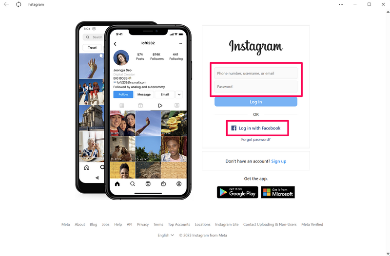 2.Sur la page de connexion, vous pouvez vous connecter à votre compte Instagram en utilisant votrenuméro de téléphone, nom d'utilisateur ou email, et mot de passe. De plus, vousconnectez-vous à l'application en utilisant votre compte Facebook.