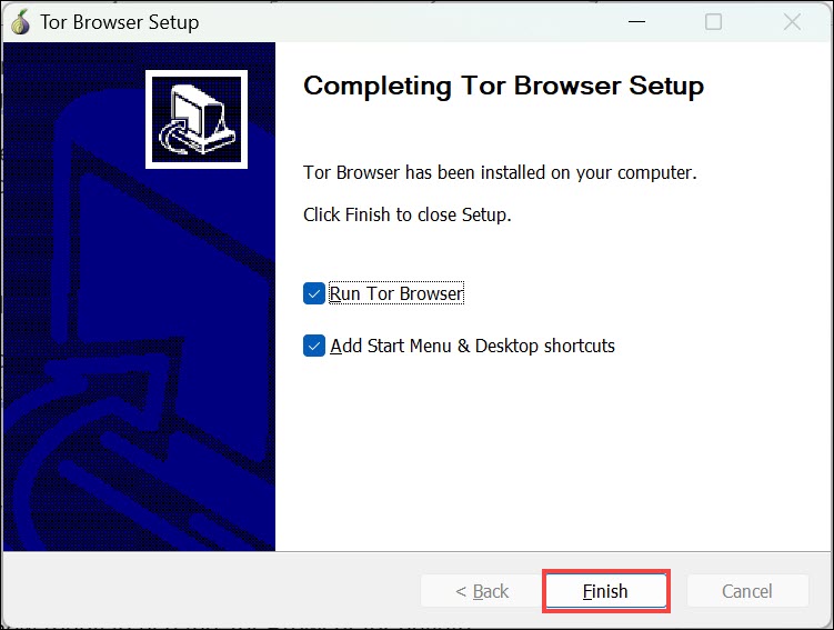 7.Après l'installation, vous aurez également la possibilité de créer un raccourci sur le bureau pour un accès facile au navigateur Tor. Cochez la case si vous souhaitez un raccourci sur le bureau.