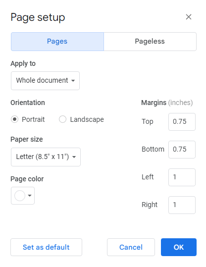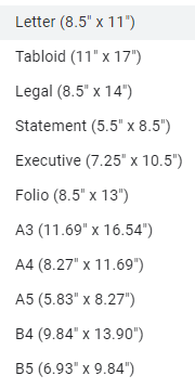 En cliquant sur le menu déroulant ci-dessousTaille des pagesfait apparaître une liste de tailles de page. Chaque entrée a un nom et des dimensions en pouces. La lettre est généralement la bonne option, mais n'hésitez pas à choisir n'importe quelle autre taille dans la liste.
