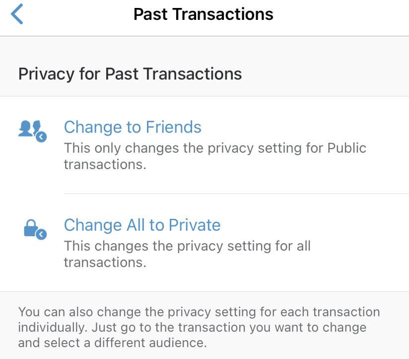 SélectionPasser aux amisne modifiera que les transactions publiques. Changer tout en privé modifiera chacune de vos transactions. Vous ne pourrez pas redéfinir les transactions privées sur Public ou Amis si vous sélectionnez cette option.