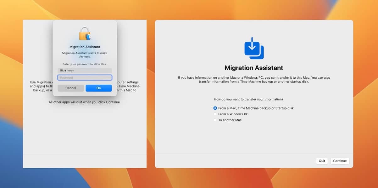 - Ensuite, dans la fenêtre Assistant de migration, cliquez sur le bouton « Continuer » pour saisir votre mot de passe administrateur et cliquez sur « OK » pour continuer sur les deux ordinateurs.