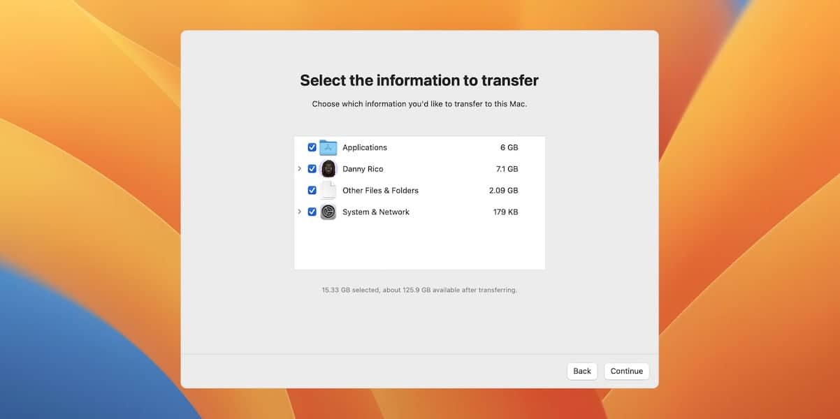 - Sur le nouveau Mac, sélectionnez les données/contenus que vous souhaitez transférer depuis l'ancienne machine : applications, compte utilisateur, fichiers et dossiers, ainsi que paramètres système et réseau.