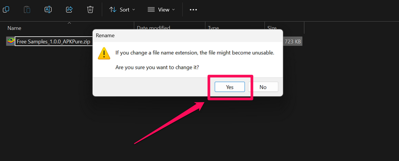 5Sur l'invite suivante, Windows 11 vous dira que le renommer (et la conversion) Le fichier APK pourrait le rendre inutilisable sur la plate-forme. Cliquez surBouton ouipour confirmer l'action.