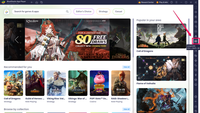 10Vous pouvez ensuite cliquer sur leInstallez le bouton APKsurbarre de menu. Alternativement, vous pouvez appuyer sur Ctrl + Shift + B pour effectuer la même action dans Bluestacks.