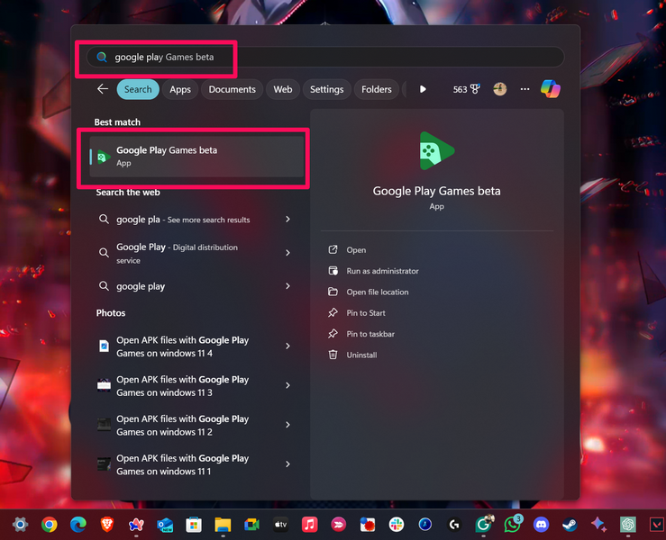 7Maintenant, utilisez Windows + S pour ouvrirRecherche Windows,Localisez l'application Google Play Games, etCliquez dessus pour ouvrir.