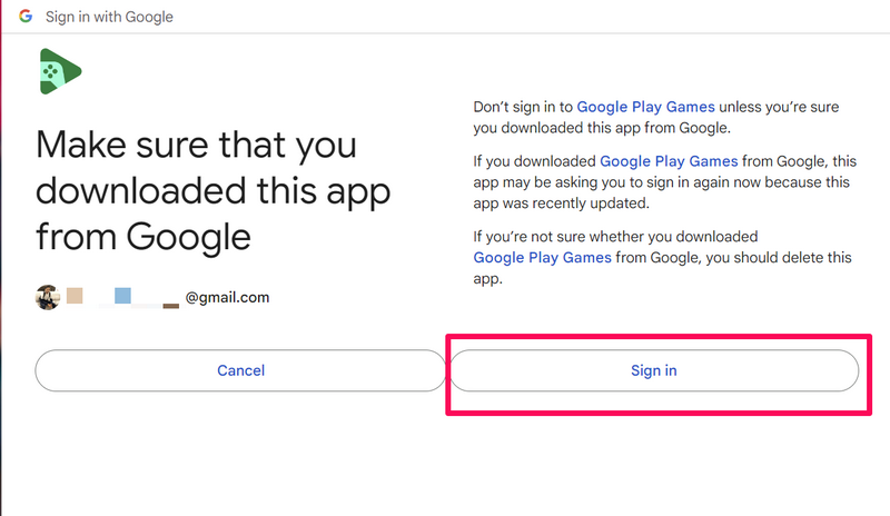 9.FDéposez les instructions à l'écranet cliquez sur leBouton de connexionPour confirmer que vous avez téléchargé l'application Google Play Games sur le site officiel de Google. Il s'agit de vous empêcher de fournir vos informations d'identification de compte Google à toute application de phishing qui pourrait se faire passer pour l'application Google Play Games.