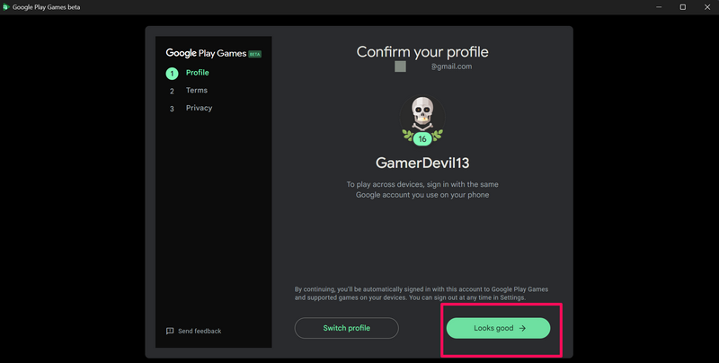 10Choisissez votre profil de jeux Google Play existant ou passez à un autre. Cliquez surSemble bon boutonLorsque vous avez terminé.