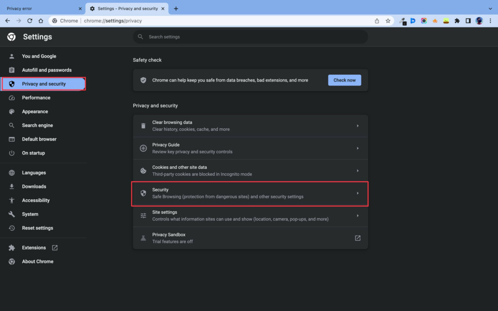 2.Aller àConfidentialité et sécuritéoptions dans la barre latérale, puis sélectionnezSécuritéparmi les options proposées.