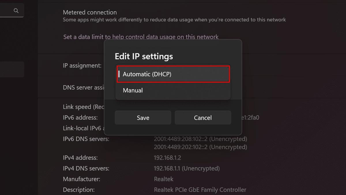- Une fois terminé, la configuration TCP/IP attribuée statiquement à Windows 11 sera supprimée et votre ordinateur utilisera une adresse IP dynamique de votre serveur DHCP.