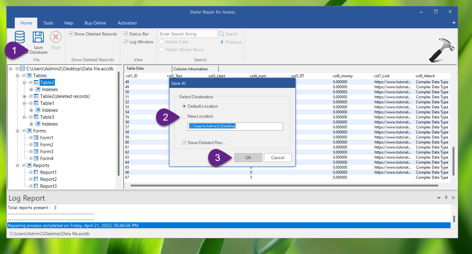 Enfin, vous pouvez enregistrer le fichier de base de données réparé. Cliquez simplement sur le"Enregistrer la base de données"option, puis sélectionnez un emplacement et cliquez sur OK.