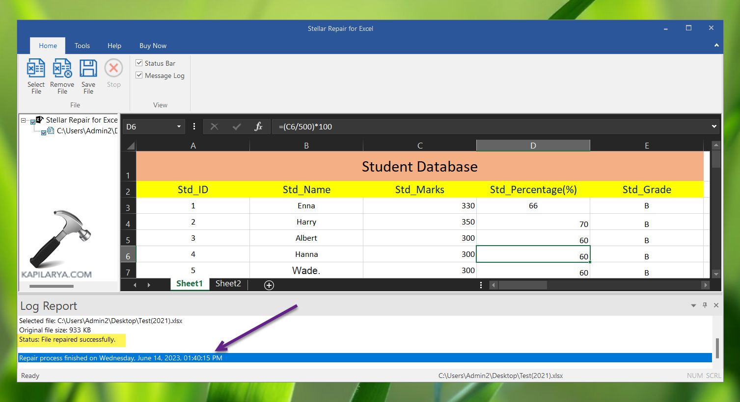 - Une fois le fichier Excel corrompu réparé, vous verrez l'état terminé du processus de réparation avec un horodatage. Vous pouvez prévisualiser le contenu du fichier Excel réparé à ce stade.