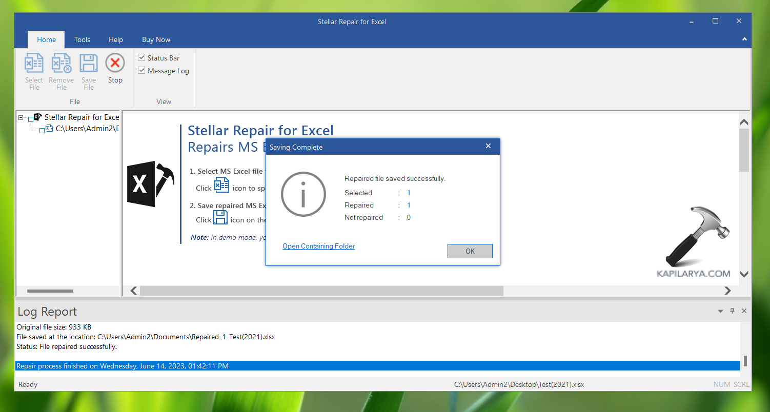- Afin de sauvegarder le fichier Excel réparé, cliquez sur Enregistrer le fichier. Cette fonctionnalité est disponible lorsque vous avez acheté l’outil et que vous utilisez la version payante.