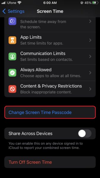 - Faites défiler vers le bas et appuyez surModifier le code d'accès au temps d'écran.