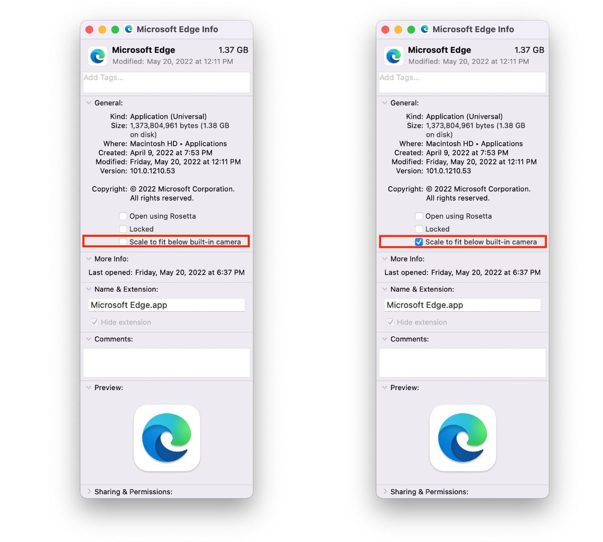 Pour ces applications, qui n'ont pas été mises à jour pour les nouveaux modèles de MacBook Pro, Apple a développé une fonctionnalité qui peut être activée pour chaque application. Appelée « Ajuster à l'échelle sous la caméra intégrée », cette fonctionnalité force la barre de menus et les fenêtres d'application à apparaître sous l'encoche de la caméra, ce qui réduit efficacement l'espace d'affichage vertical mais garantit que votre barre de menus n'est pas obstruée par l'encoche.