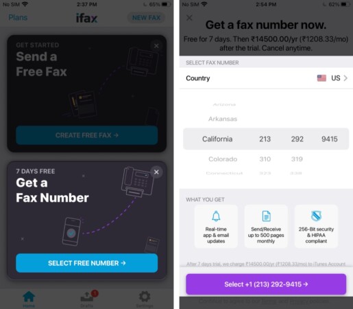 Vous pouvez également utiliser l'application iFax pour obtenir un numéro de fax afin de recevoir des documents. Pour cela, appuyez surObtenir un numéro de faxsur l'écran d'accueil de l'application et sélectionnez votreemplacementetnombre.