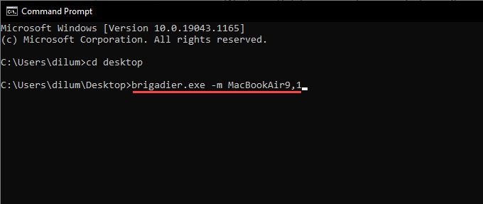 4.Entrez lebrigadier.exe -m MacBookAir9,1commande, puis appuyez sur la toucheEntrerclé pour l'exécuter.
