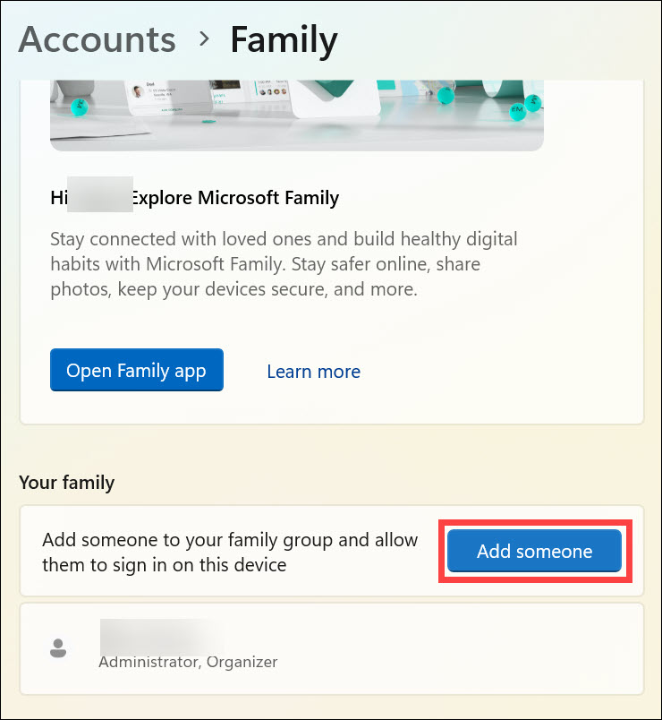 3.Sur la page suivante, sous la rubrique « Votre famille », cliquez surAjouter quelqu'unbouton.