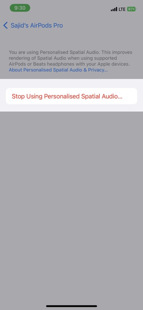 5Appuyez sur leArrêtez d'utiliser l'audio spatial personnaliséoption.