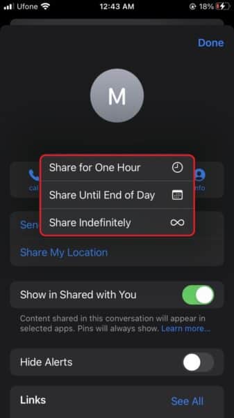 - Maintenant, vous pouvez appuyer surEnvoyer mon courantEmplacement. Cela permettra à vos contacts de voir votre position sur la carte. Ou vous pouvez appuyer surPartager ma position, qui vous permettra de choisir la durée pendant laquelle vous souhaitez partager votre position.